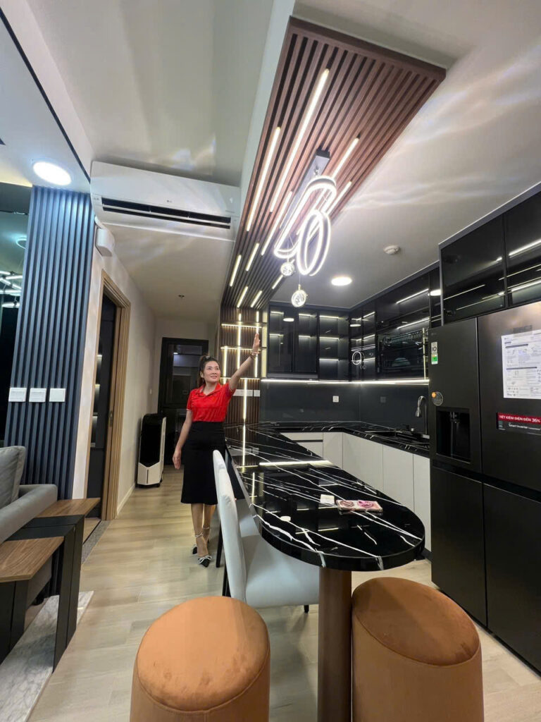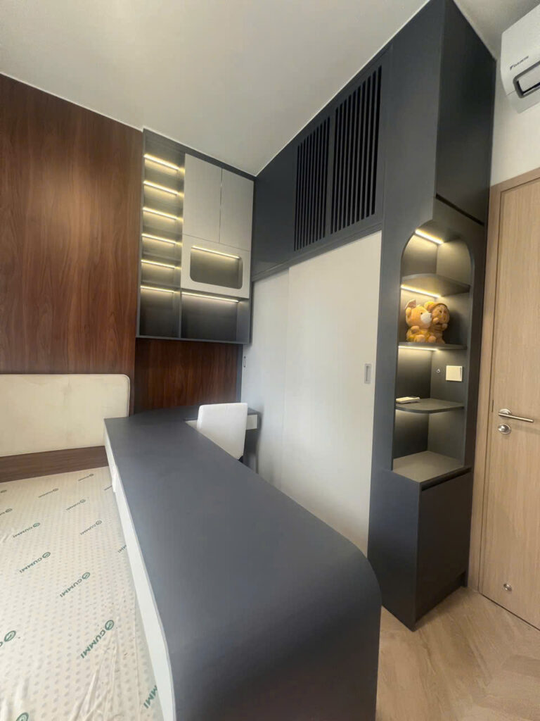 Phối màu Đen – Xám – Gỗ ấm kết hợp đèn khe, kính – gương và các chi tiết kim loại gold mang lại vẻ sang trọng nhưng vẫn gần gũi, đồng thời tối ưu công năng cho gia đình trẻ: bếp mạnh – lưu trữ tốt – ngủ êm.