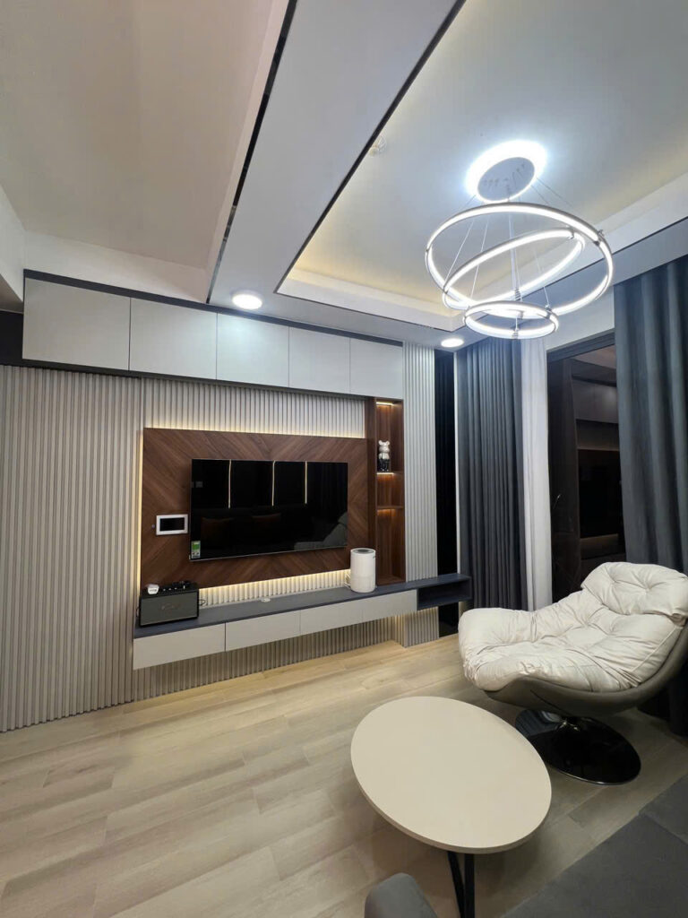 - Đèn: LED dây profile nhôm 8–12W/m; downlight 9W; đèn thả vòng/line.