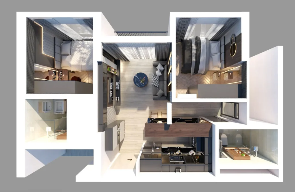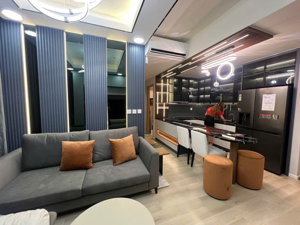 Căn hộ 2 phòng ngủ theo phong cách Modern Luxury tại Lumiere Thủ Đức với bảng màu xám–đen–gỗ ấm, nhấn nhá kim loại màu gold và hệ đèn khe LED. Ý tưởng trọng tâm là tạo độ “sang ấm”, mặt bằng mở khách – bếp – bàn đảo liền mạch, nhiều diện “gương/kính” để tăng chiều sâu không gian.