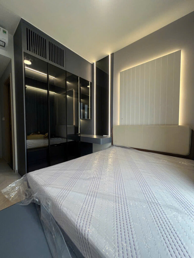 - Tủ áo kính đen/laminate, dài 1.8–2.0 m, sâu 600 mm.