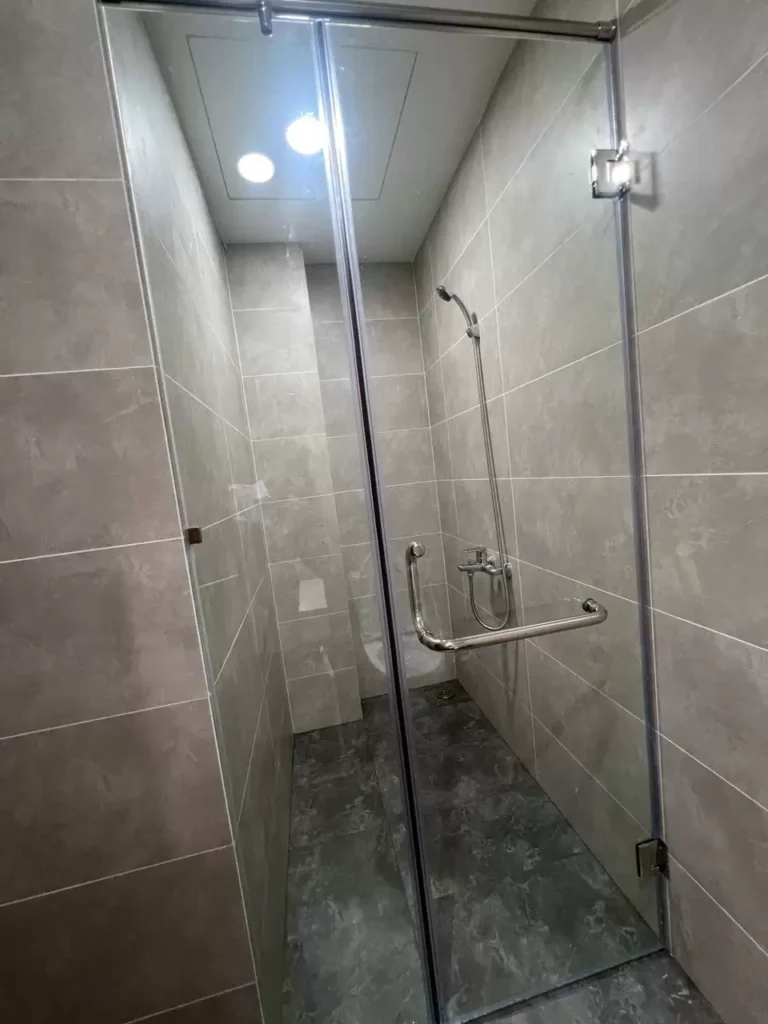 Vách kính ngăn khu tắm giữ sự gọn gàng và dễ vệ sinh.