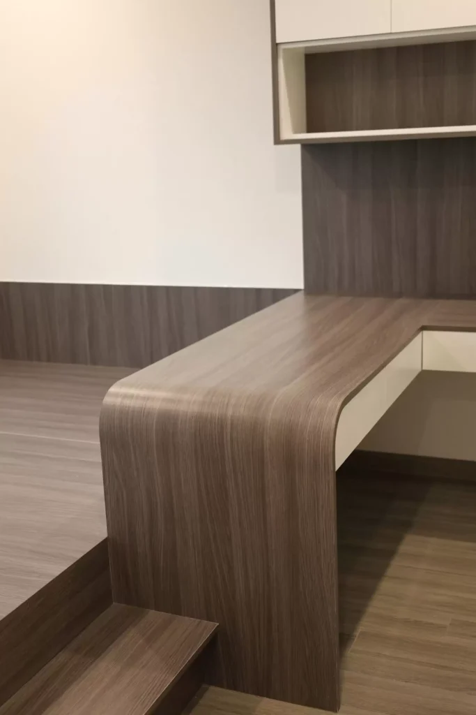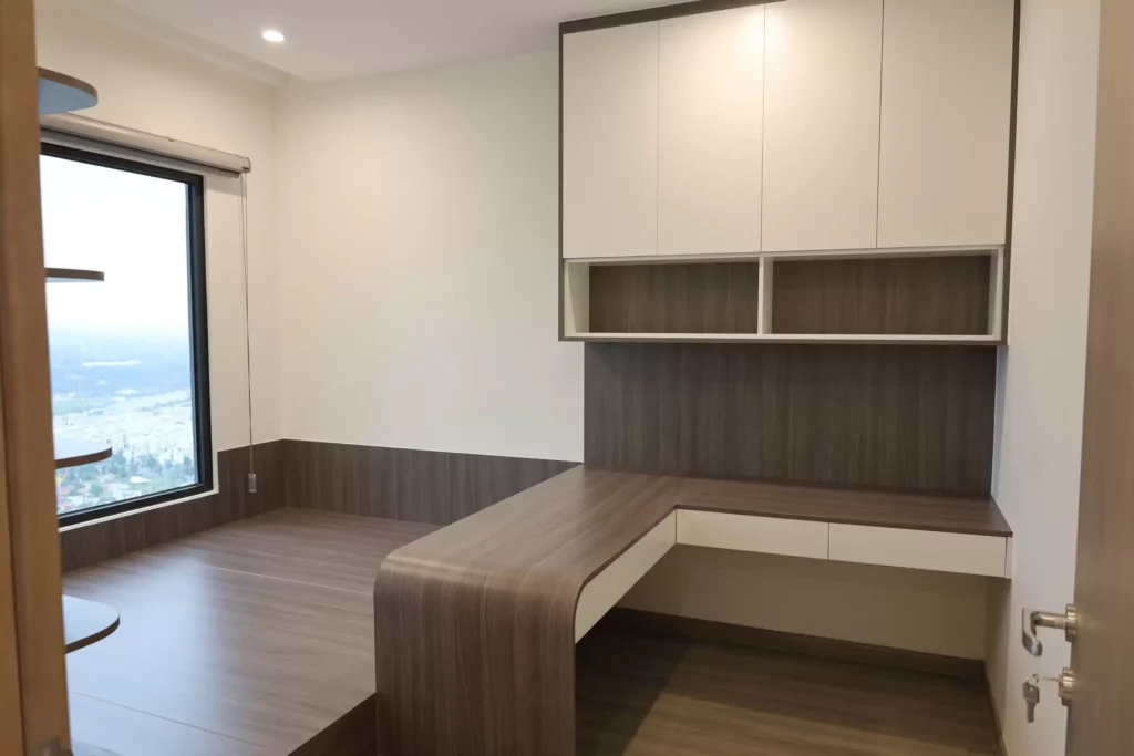 Bàn làm việc + tủ treo: thiết kế liền khối với giường, vừa làm việc vừa làm bàn trang điểm. Tủ treo phía trên có nhiều khoang lưu trữ sách, tài liệu, phụ kiện cá nhân.