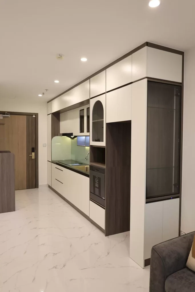 Tủ thiết bị âm tường: tích hợp lò vi sóng, lò nướng và tủ lạnh side by side, tối ưu diện tích và đồng bộ thẩm mỹ.