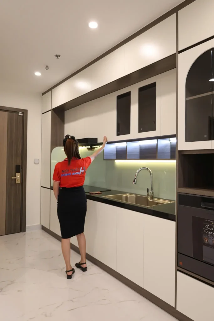 Tủ bếp trên: kịch trần, phủ trắng An Cường, giúp tăng diện tích lưu trữ, hạn chế bụi bẩn. Các ngăn chia khoang để bát đĩa, gia vị, thực phẩm khô.